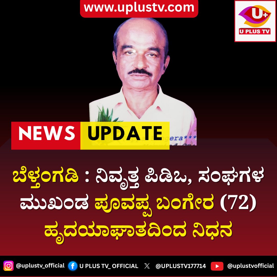 ಬೆಳ್ತಂಗಡಿ (ಅ.8): ನಿವೃತ್ತ ಪಂಚಾಯತ್ ಅಭಿವೃದ್ಧಿ ಅಧಿಕಾರಿ (PDO) ಹಾಗೂ ಸ್ಥಳೀಯ ಸಂಸ್ಥೆಗಳ ಪ್ರಮುಖ ಮುಖಂಡರಾಗಿದ್ದ ಪೂವಪ್ಪ ಬಂಗೇರ (72) ಅವರು ಅಕ್ಟೋಬರ್ 8 ರಂದು ಹೃದಯಾಘಾತದಿಂದ ನಿಧನರಾಗಿದ್ದಾರೆ.