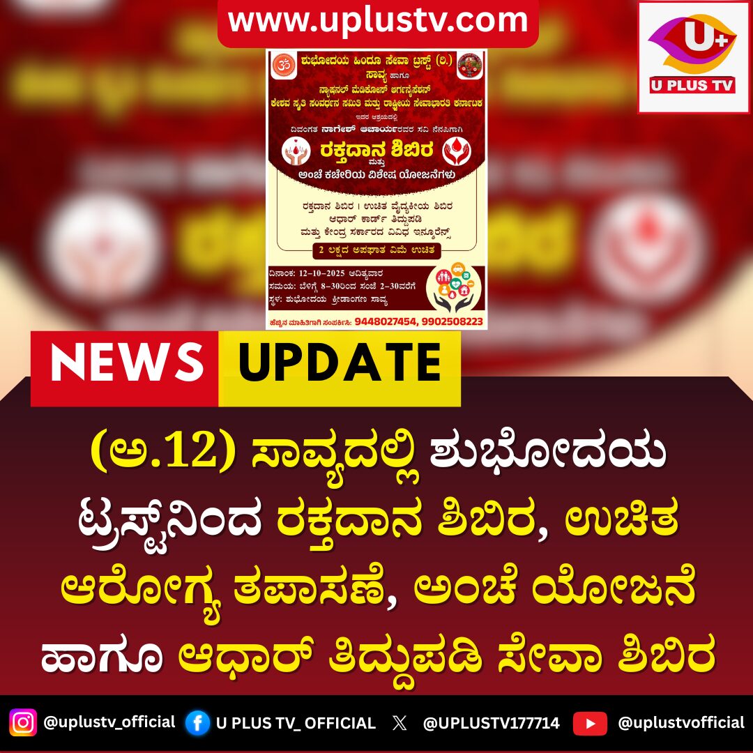 ಬೆಳ್ತಂಗಡಿ (ಅ.09) : ಶುಭೋದಯ ಹಿಂದೂ ಸೇವಾ ಟ್ರಸ್ಟ್ (ರಿ.), ನ್ಯಾಷನಲ್ ಮೆಡಿಕೋರ್ ಆರ್ಗನೈಸೇಷನ್, ಕೇಶವ ಸ್ಮೃತಿ ಸಂವರ್ಧನ ಸಮಿತಿ ಮತ್ತು ರಾಷ್ಟ್ರೀಯ ಸೇವಾಭಾರತಿ ಕರ್ನಾಟಕ ಸಂಸ್ಥೆಗಳ ಸಹಯೋಗದೊಂದಿಗೆ ಬೃಹತ್ ಸಮುದಾಯ ಸೇವಾ ಕಾರ್ಯಕ್ರಮವನ್ನು ಆಯೋಜಿಸಿದೆ. ಈ ಕಾರ್ಯಕ್ರಮದಲ್ಲಿ ರಕ್ತದಾನ ಶಿಬಿರ ಮತ್ತು ಉಚಿತ ವೈದ್ಯಕೀಯ ಶಿಬಿರವನ್ನು ಹಮ್ಮಿಕೊಳ್ಳಲಾಗಿದೆ. ದಿವಂಗತ ನಾಗೇಶ ಆಚಾರ್ಯವರವರ ಸ್ಮರಣಾರ್ಥವಾಗಿ ಈ ರಕ್ತದಾನ ಶಿಬಿರವನ್ನು ನಡೆಸಲಾಗುತ್ತಿದೆ. ಈ ಕಾರ್ಯಕ್ರಮವು ಭಾನುವಾರ, ಅಕ್ಟೋಬರ್ 12, 2025 ರಂದು ಬೆಳಿಗ್ಗೆ 8:30 ರಿಂದ ಸಂಜೆ 2:30 ರವರೆಗೆ ಸಾವ್ಯದ ಶುಭೋದಯ ಕ್ರೀಡಾಂಗಣದಲ್ಲಿ ನಡೆಯಲಿದೆ.