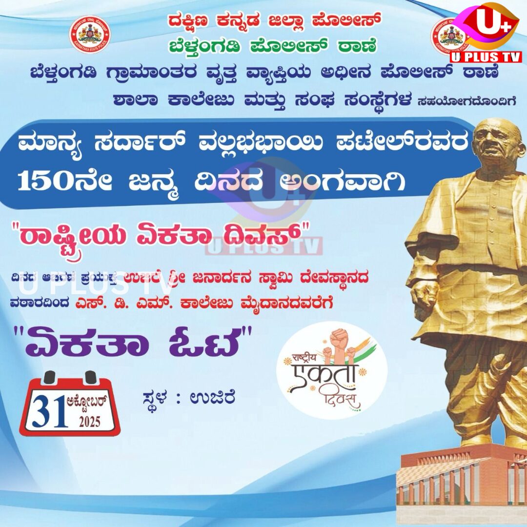 ಸರ್ದಾರ್ ವಲ್ಲಭಭಾಯಿ ಪಟೇಲರ 150ನೇ ಜನ್ಮದಿನ ದ ಅಂಗವಾಗಿ ರಾಷ್ಟ್ರೀಯ ಏಕತಾ ದಿವಸ್ ಪ್ರಯುಕ್ತ ಅಕ್ಟೋಬರ್ 31 ರಂದು ಉಜಿರೆಯ ಶ್ರೀ ಜನಾರ್ದನ ಸ್ವಾಮಿ ದೇವಸ್ಥಾನದ ವಠಾರದಿಂದ ಎಸ್ ಡಿ ಎಮ್ ಕಾಲೇಜು ಮೈದಾನದವರೆಗೆ ಬೆಳಿಗ್ಗೆ 7.30 ಕ್ಕೆ ಏಕತಾ ಓಟ ನಡೆಯಲಿದೆ.