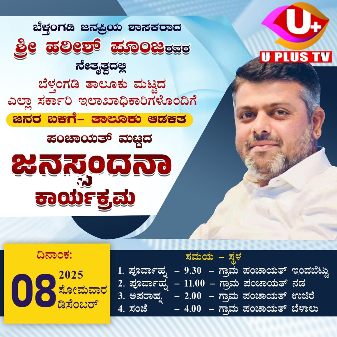 ಬೆಳ್ತಂಗಡಿ: ಬೆಳ್ತಂಗಡಿ ಕ್ಷೇತ್ರದ ಶಾಸಕರಾದ ಶ್ರೀ ಹರೀಶ್ ಪೂಂಜ ಅವರ ನೇತೃತ್ವದಲ್ಲಿ ಬೆಳ್ತಂಗಡಿ ತಾಲೂಕು ಆಡಳಿತವು ಮಹತ್ವದ ಹೆಜ್ಜೆಯನ್ನಿಟ್ಟಿದೆ. ದಿನಾಂಕ: 08 ಡಿಸೆಂಬರ್ 2025, ಸೋಮವಾರ ದಂದು ಬೆಳ್ತಂಗಡಿ ತಾಲೂಕು ಮಟ್ಟದ ಎಲ್ಲ ಸರ್ಕಾರಿ ಇಲಾಖಾಧಿಕಾರಿಗಳೊಂದಿಗೆ ‘ಜನರ ಬಳಿಗೆ-ತಾಲೂಕು ಆಡಳಿತ’ ಪಂಚಾಯತ್ ಮಟ್ಟದ ಜನಸ್ಪಂದನಾ ಕಾರ್ಯಕ್ರಮವನ್ನು ಹಮ್ಮಿಕೊಳ್ಳಲಾಗಿದೆ.